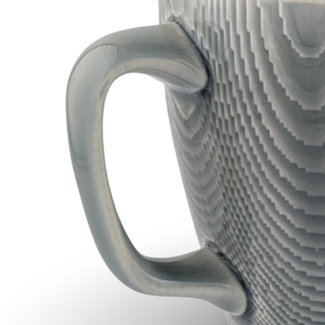 This is my “close” handle design, which hugs the contours of the mug. This handle offers good leverage for the weight of the liquid, but is not so close that your knuckles make contact with the hot cup. It comfortably fits two or three fingers depending on how big they are, but definitely is not for one-finger use.