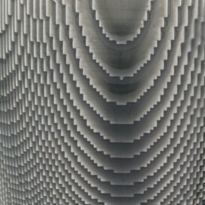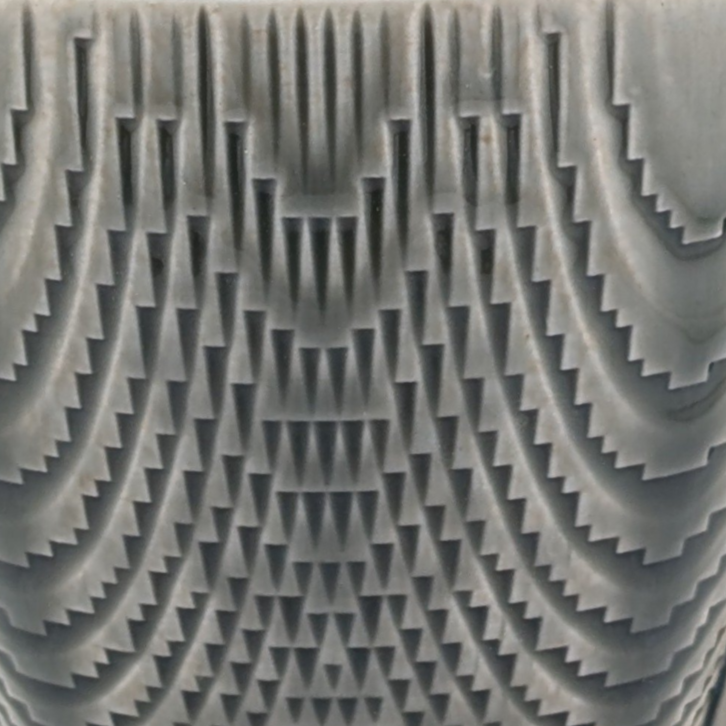 The knockdown surface is a bolder, but smoother version of the tactile surface. In the digital environment, the pixellated form is intersected with the smooth version of the same form. The result is a shaved down outer surface that allows the glaze to form a smooth coat, while converting the squares into triangles. Surface tension in the glaze directs it to accumulate and form rivulets of thicker glaze, reactive to the pattern.