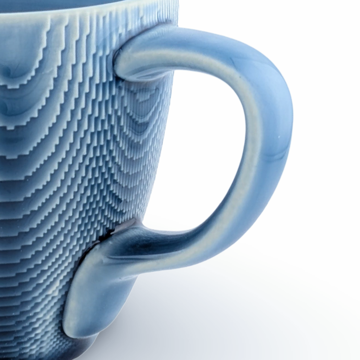 Based on the excellent article by Old Forge Pottery in the UK, my new “wiggle” handle design might look a bit weird, but is extremely ergonomic for 2 finger use. The inset ring finger notch creates an effortless vertical position for the mug while the hand is in its most natural position. It basically disappears in your sensory experience and is quite nice, but it does not work with more or fewer fingers.