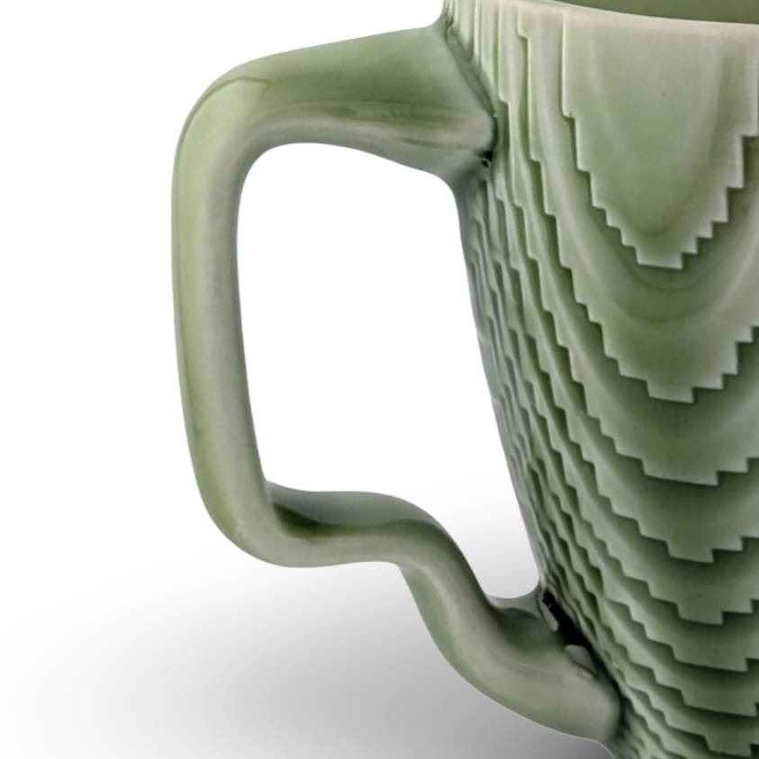 This surface is built in the digital environment and comes from the conversion of curved and rounded forms into tiny cubes known as voxels, or volume pixels. When the curves are described in tiny cubes, patterns emerge that are unexpected and complex. The closer you look, the more you see. The points of the voxels poke through the glaze’s surface tension, creating a very tactile surface that you can feel. The glaze pools in the valleys and has a sort of sparkle to it.