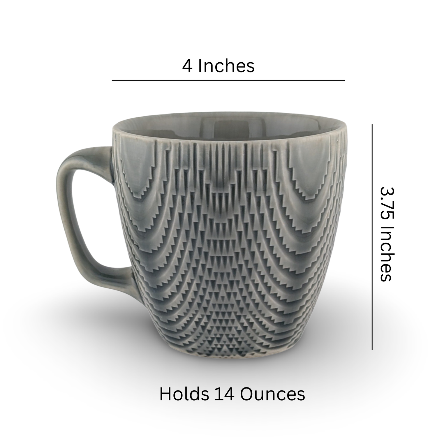 This is a generous, but not massive cup. It is 4 inches wide at the rim and 3.75 inches tall. It holds 14 Ounces of coffee or tea.
